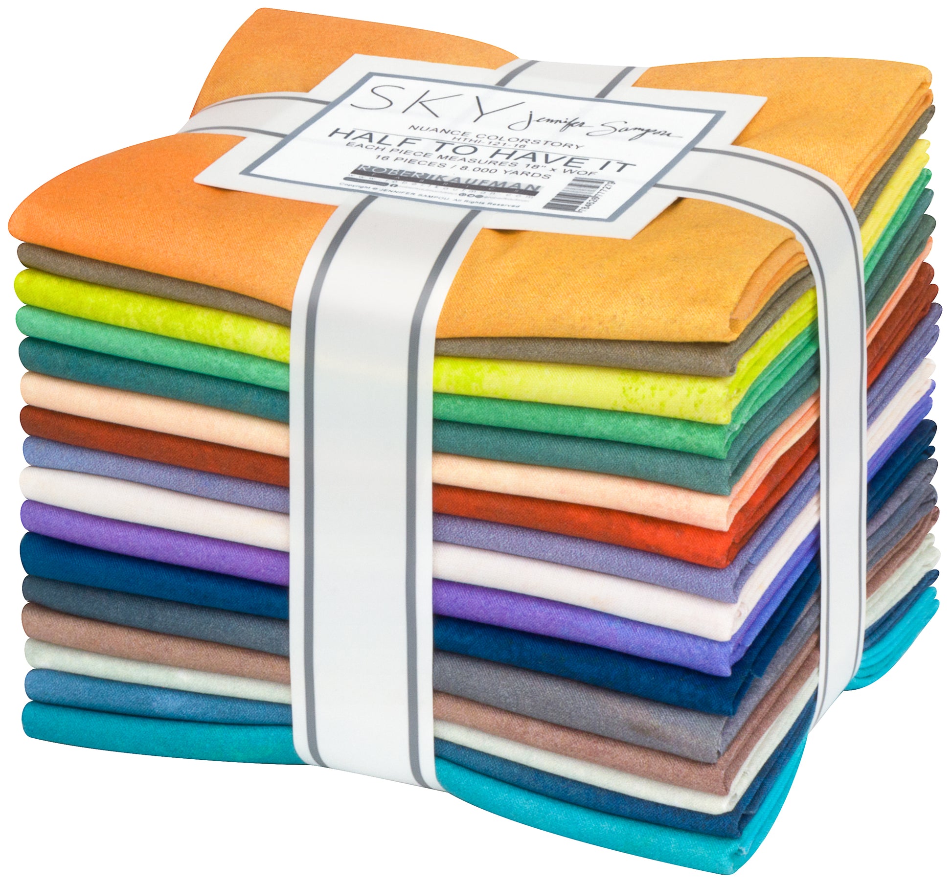 16 Nuance sky ombré fabrics make up this bundle in half-yard cuts. Papaya, Sandstone, Citrus, Fern, Canyon, Shell, Tiger Lily, Heather, Prism, Pansy, Northern Lights, Abalone, Mushroom, Quartz, Ocean, Glacier. This premium digitally printed cotton precut coordinated to save time picking your palette.